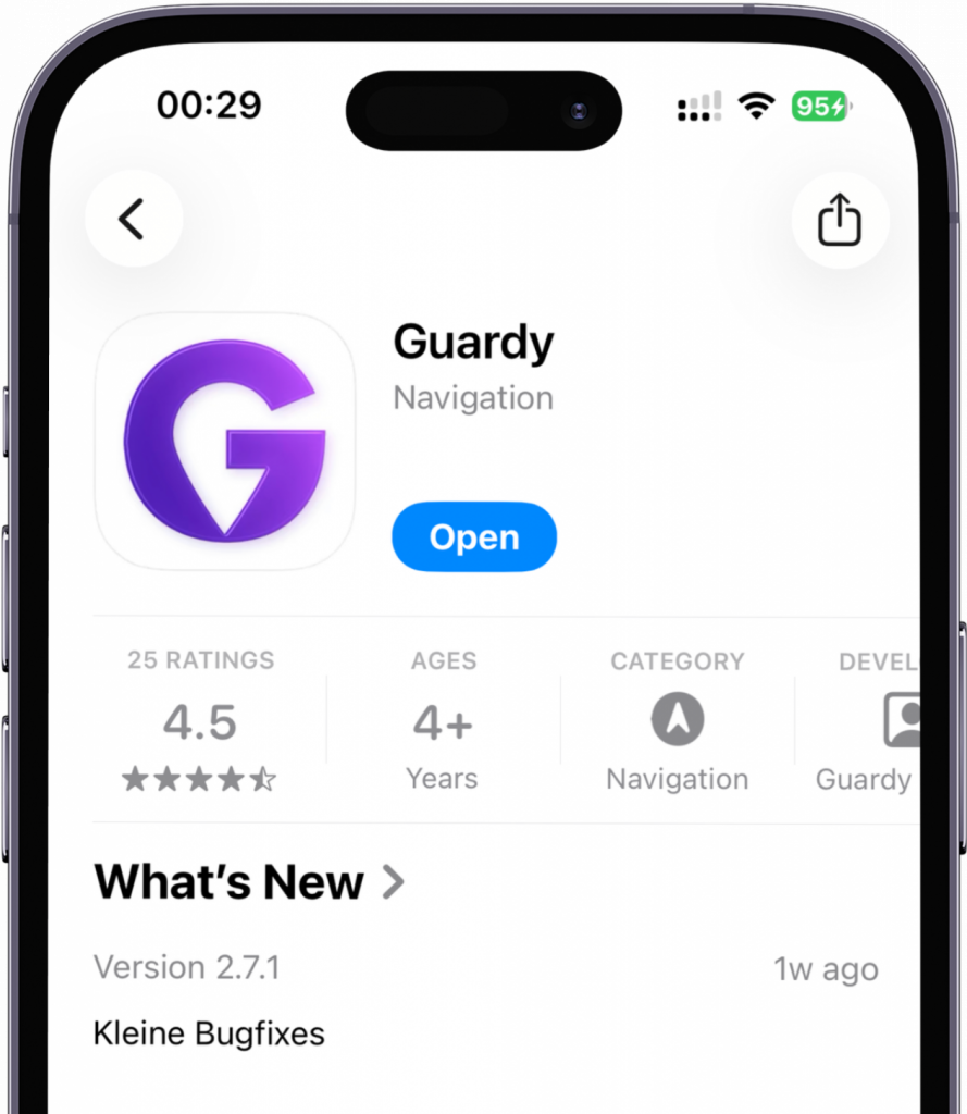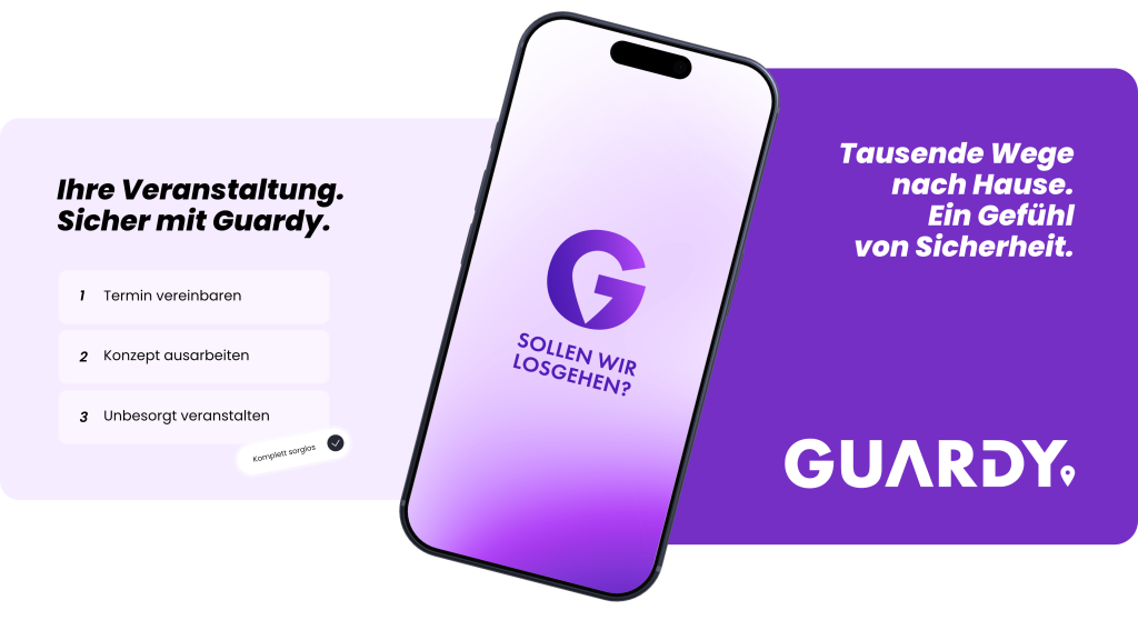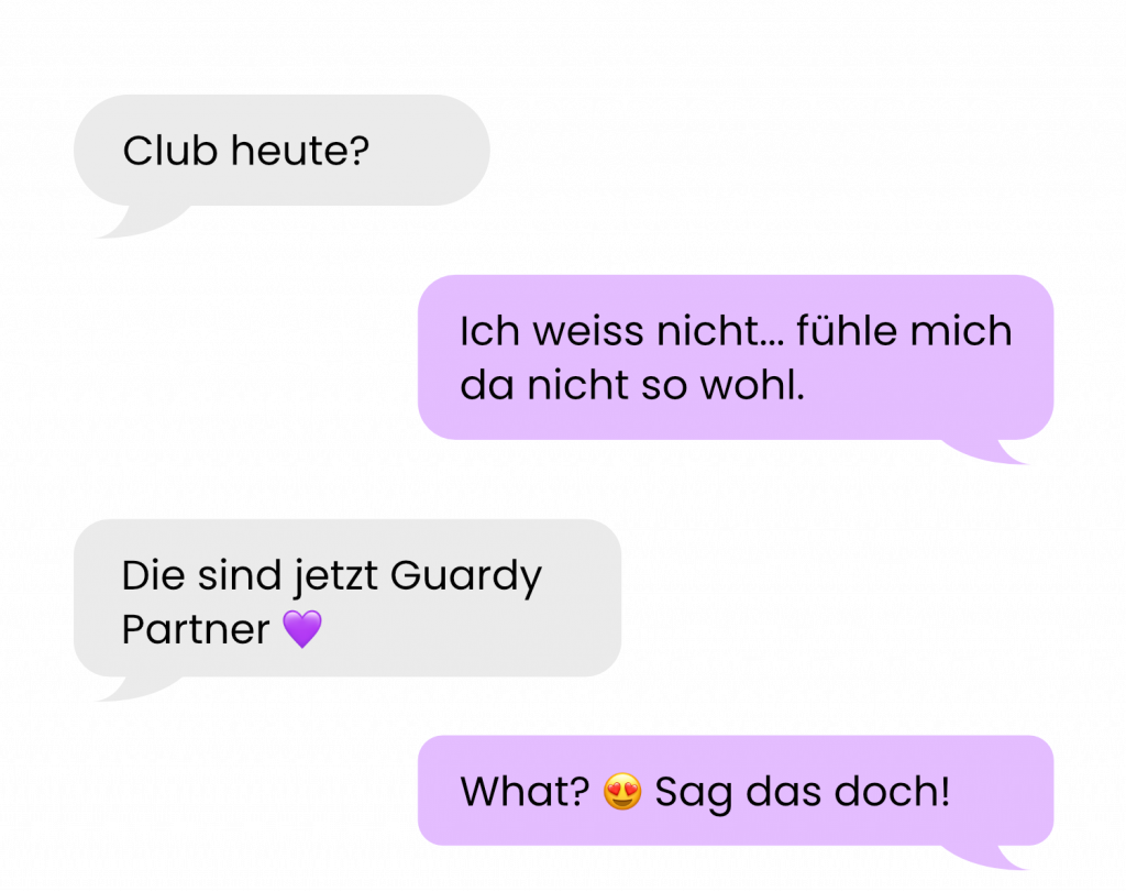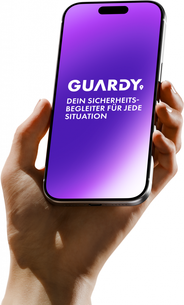 Guardy informiert im Notfall automatisch deine Notfallkontakte. Per Alarm teilst du entweder deinen Live-Standort oder startest einen Live-Stream – sofort und unkompliziert.