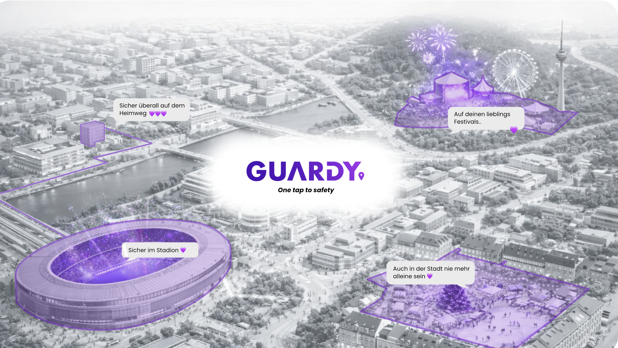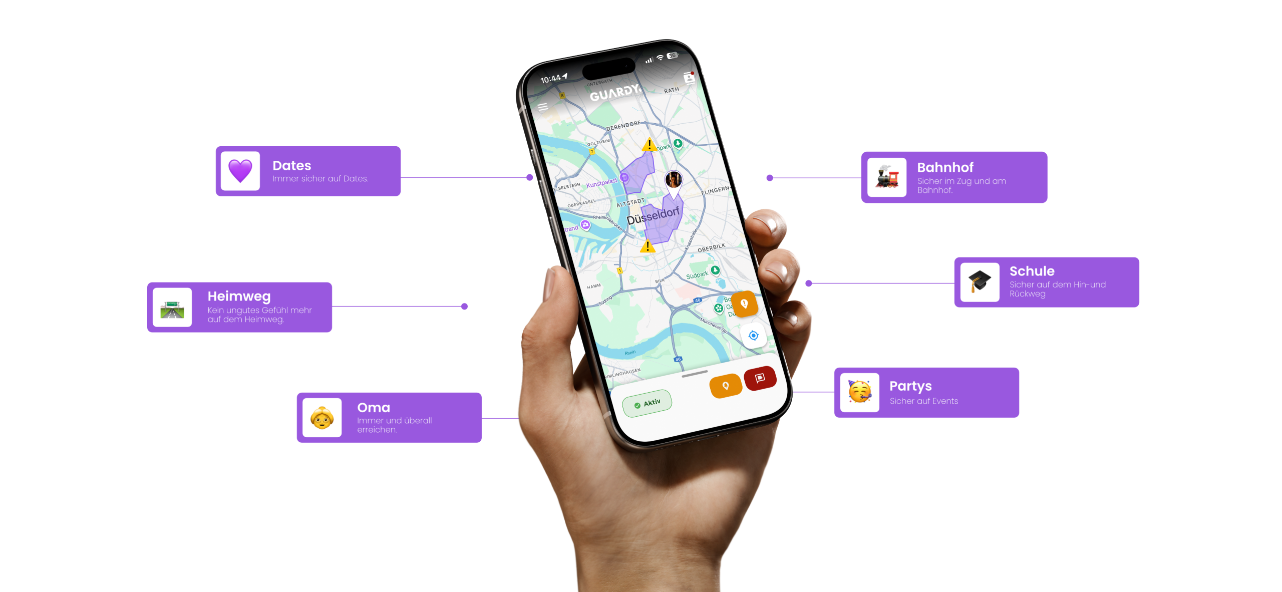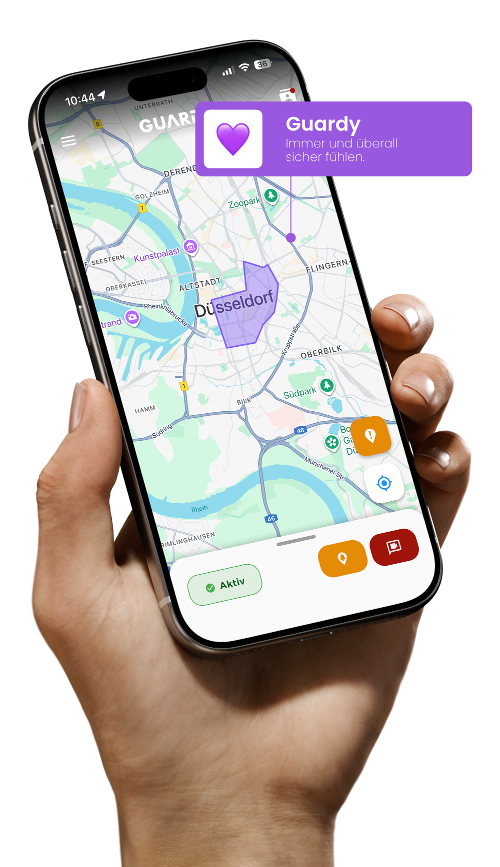 Guardy informiert im Notfall automatisch deine Notfallkontakte. Per Alarm teilst du entweder deinen Live-Standort oder startest einen Live-Stream – sofort und unkompliziert.