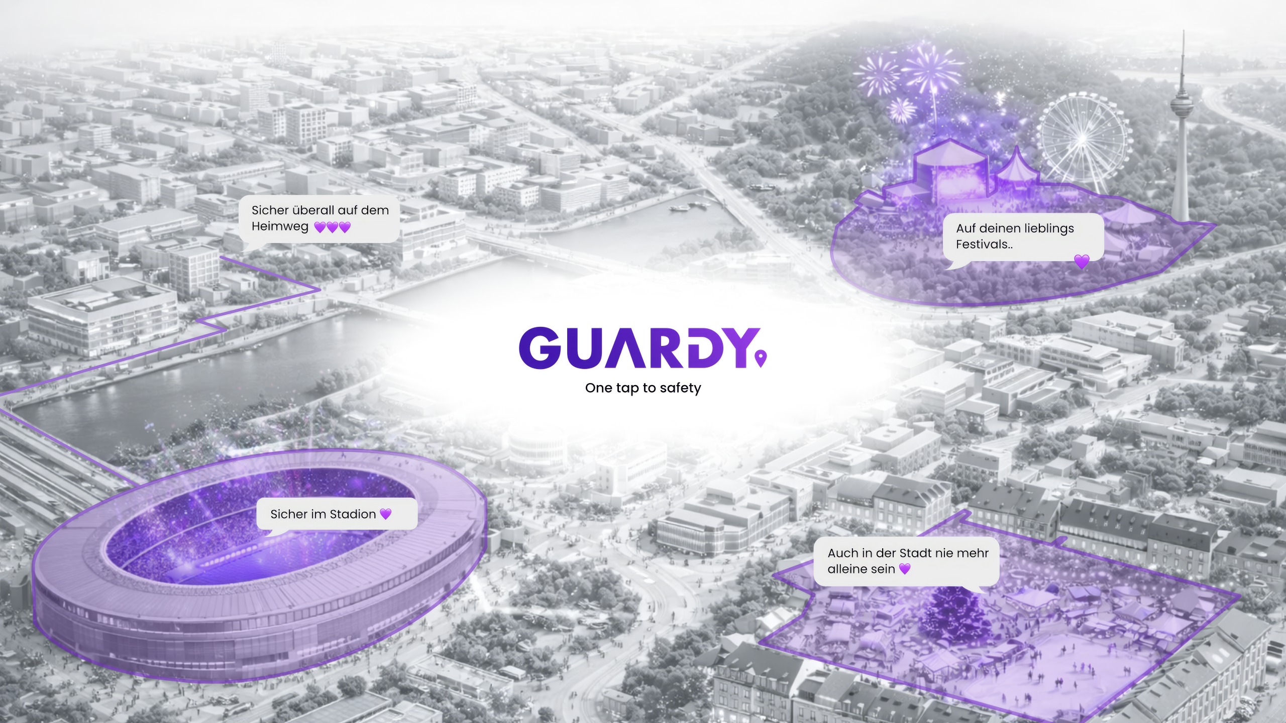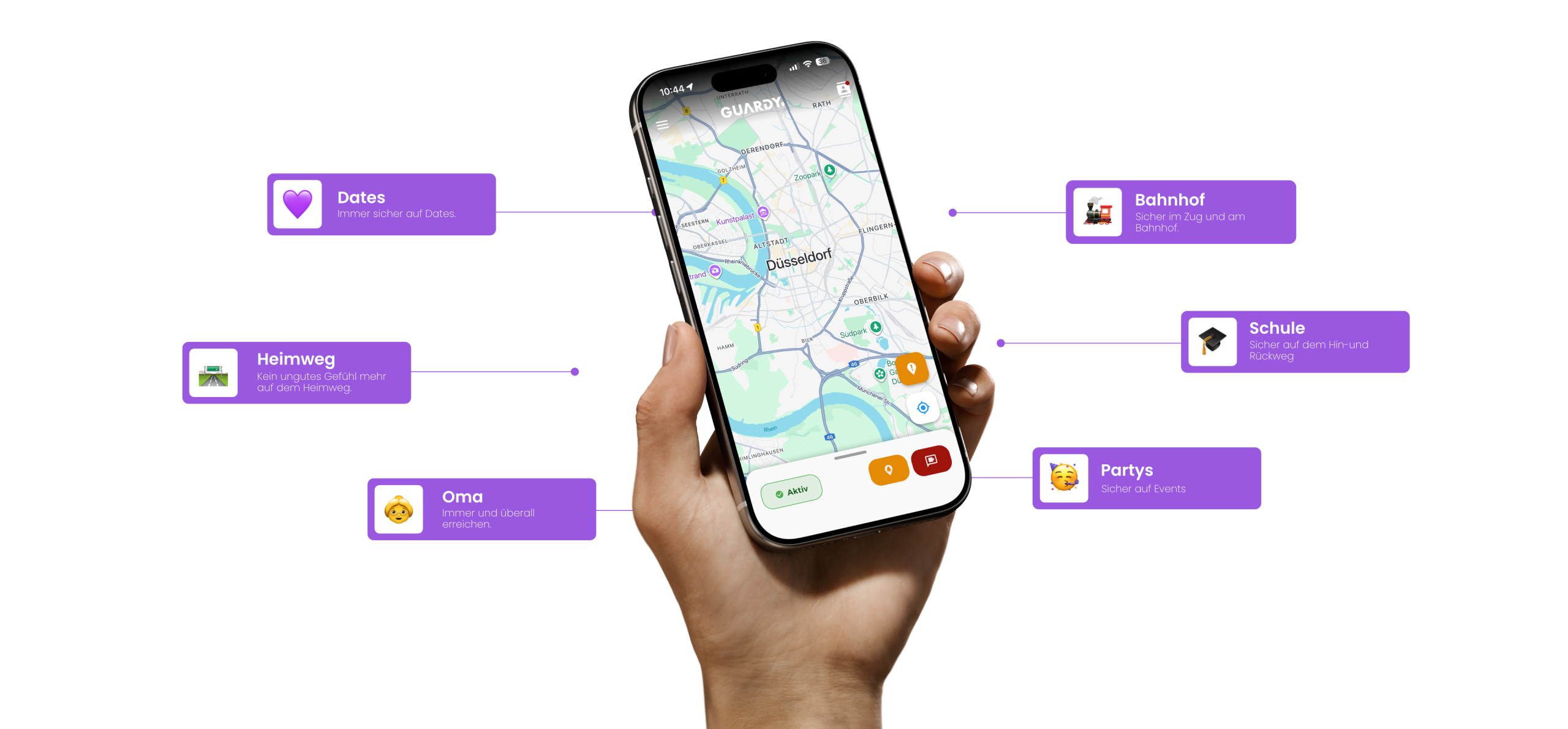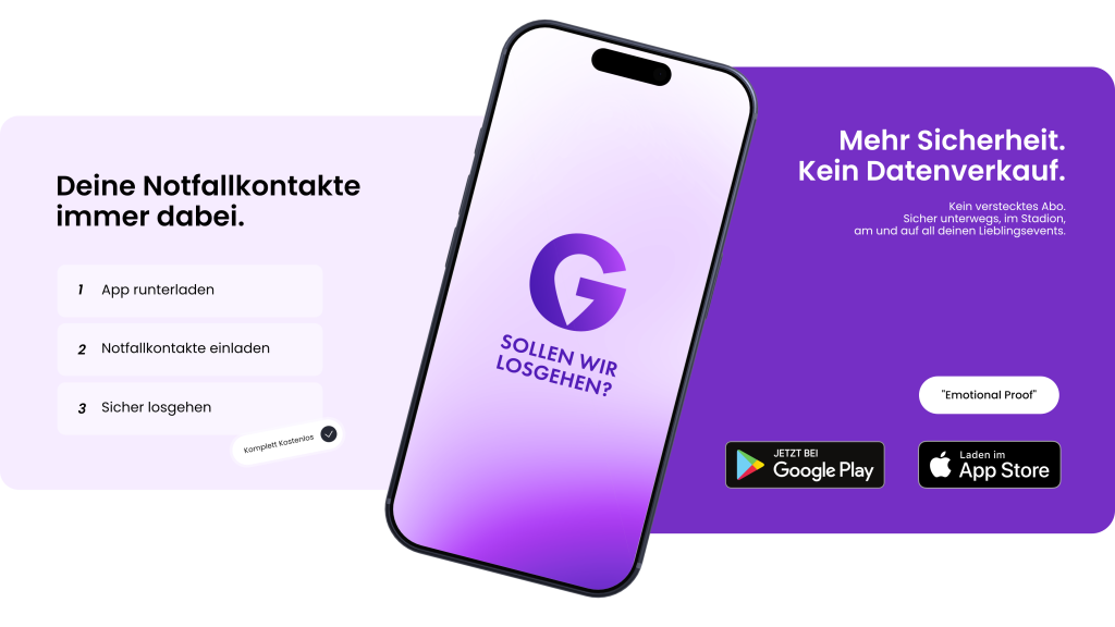 Guardy informiert im Notfall automatisch deine Notfallkontakte. Per Alarm teilst du entweder deinen Live-Standort oder startest einen Live-Stream – sofort und unkompliziert.